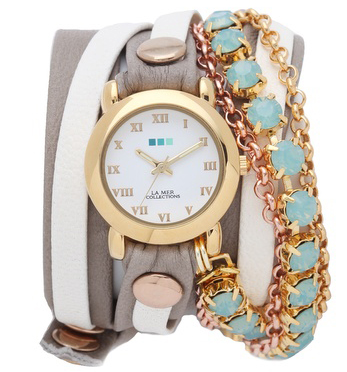 This La Mer Collections St. Tropez Chain Wrap Watch features an Italian leather band, stud details, and a round case. Contrast leather overlay at strap. Opalescent rhinestone strand and mixed-metal chains. Adjustable length and buckle closure. Made in the USA. $165. Free worldwide express delivery. Buy here