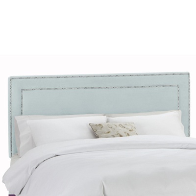 This elegant Upholstered Nail Button Border Headboard is trimmed with two rows of stylish brass nail buttons. The sturdy wood frame is covered with thick polyfoam/dacron padding and upholstered in a soft and durable, 100% polyester velvet fabric. Choose from designer colors. Headboard easily attaches to most standard metal bed frames with metal legs and hardware provided. Headboard adjusts in height to accommodate thicker mattresses. Hand upholstered in USA. $329.99-$449.99. Buy here.