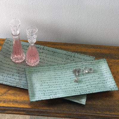 Reproduction quill script adds a vintage twist to modern glass trays. For loft or traditional living, this Set of 2 Script Serving Trays are perfect accent pieces for desk, cocktail table or vanity. In Soft Aqua. Small tray is 7″ x 14″. Large tray is 10″ x 17″. Set of 2. $39. Buy here.