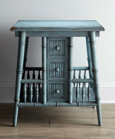 Add enchantment to your decor with this antique blue finished Ambella “Neelima” Side Table. The stylish design hosts two shelves and three drawers. Handcrafted of mahogany with mahogany veneer. 24″W x 27″D x 27″T. $799. Buy here.