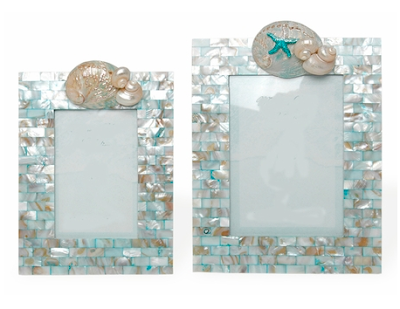 The Aqua Mother of Pearl Frames in 4×6 and 5×7 are a stunning accent for your favorite photograph. Select size and orientation; horizontal or vertical. The Aqua Mother of Pearl Frames in 4×6 and 5×7 are part of a unique collection of meticulously crafted frames designed by one of the world’s most talented shell artisans, Marjorie Bloom. Each shell is placed by hand in order to create these one of a kind testimonials to the ocean’s unspeakable majesty. $105-$135. Buy here.