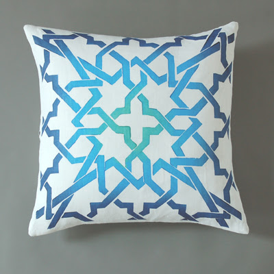 The stunning Blue Cordoba Pillow features a block-print on white linen. Down & feather insert included. Zipper back. 20 X 20 in. $168. Buy here.
