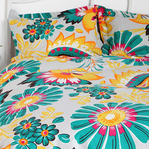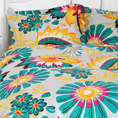 The vibrant Tropical Paisley Duvet Cover is a woven cotton duvet cover with a bright pattern. Buttoned opening at the bottom. Duvet insert and shams sold separately. Full/Queen: 86″l, 86″w. $89. Free shipping. Buy here.
