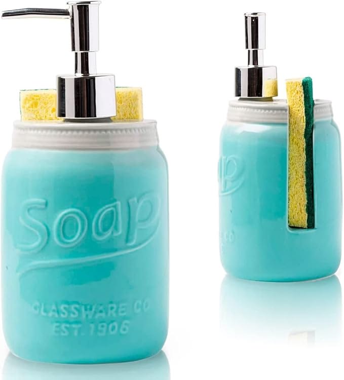 Add a pop of turquoise to your sink with this charming Mason Jar Soap Dispenser with built-in sponge caddy. The sturdy ceramic base and sleek stainless steel pump keep your counter tidy while adding a clean, farmhouse-inspired touch. $19.99. Buy here.