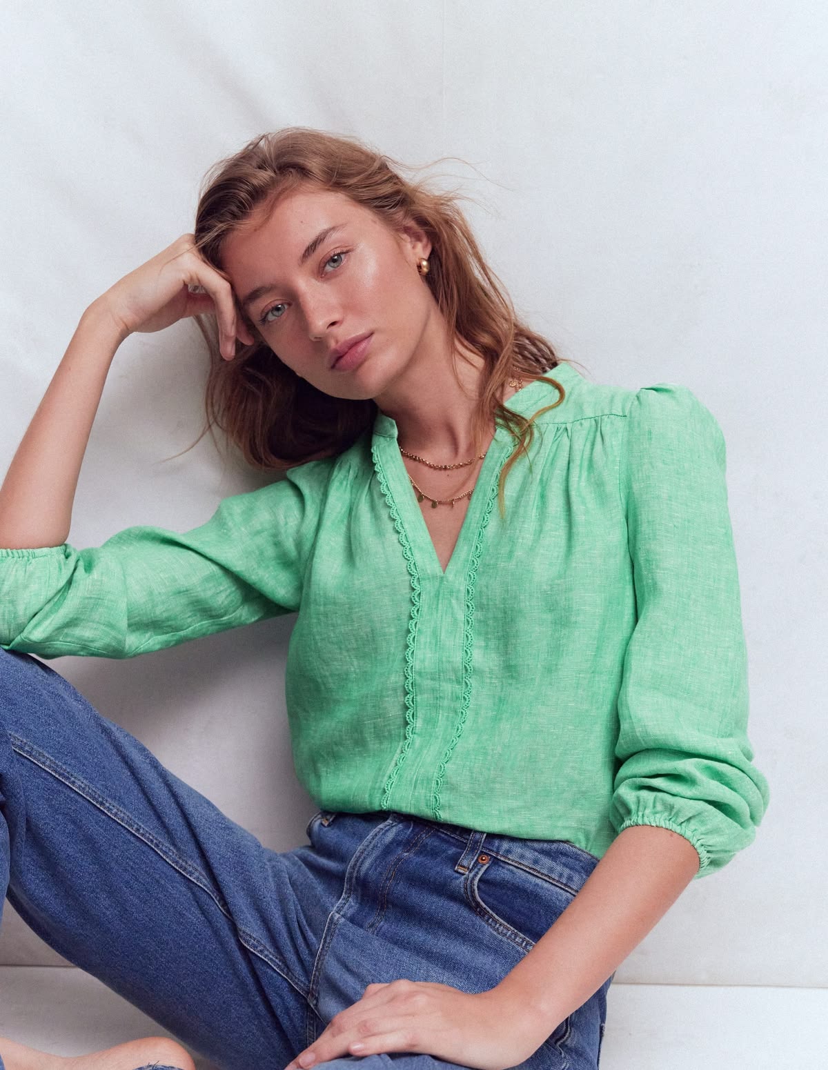 Embrace subtle boho vibes with this pure linen Linen Trim Insert Top. The delicate cotton trim and notch neckline adds elevated dimensions to what could be a standard blouse. $149. Free Shipping. Buy here. Take 15% off with code K6X7