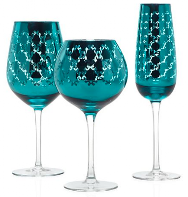 Pull out all the stops and entertain in high glamour with the Aquamarine Montecito Glassware – Set of 4. Long slender stems support clear glass bowls with an overlay of glistening, glimmering Aqua metallic, cut out to display an attractive lattice design. Serve white wine in our 24 ounce glass which measures 10 inches tall, red wine in the 24 ounce glass which measures 9 inches tall, and sparkling champagne in the 14 ounce flute measuring 11 inches tall. Hand wash only. Sold separately. $51.80 Sale $43.96. Buy here.