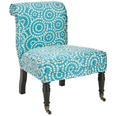 Freshen up your living space with the bright and crisp white and blue circle pattern of this contemporary Safavieh Orson Blue and White Accent Chair. The frame is crafted from birch wood, featuring turned legs in a deep espresso finish. The front two legs come on casters, making it easy to move the chair. $767.91. Free shipping. Buy here