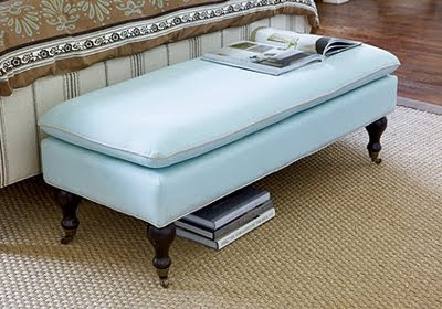 The attached pillow top takes the versatile Grayson Upholstered Bench from functional to fashionable. A welcome perch at the foot of a bed or beneath a window, the solid hardwood frame is artisan crafted and expertly hand upholstered in a soft cotton/linen blend with piped edge. Turned bulb feet are accented with antiqued brass casters for easy positioning. $399. Buy here.