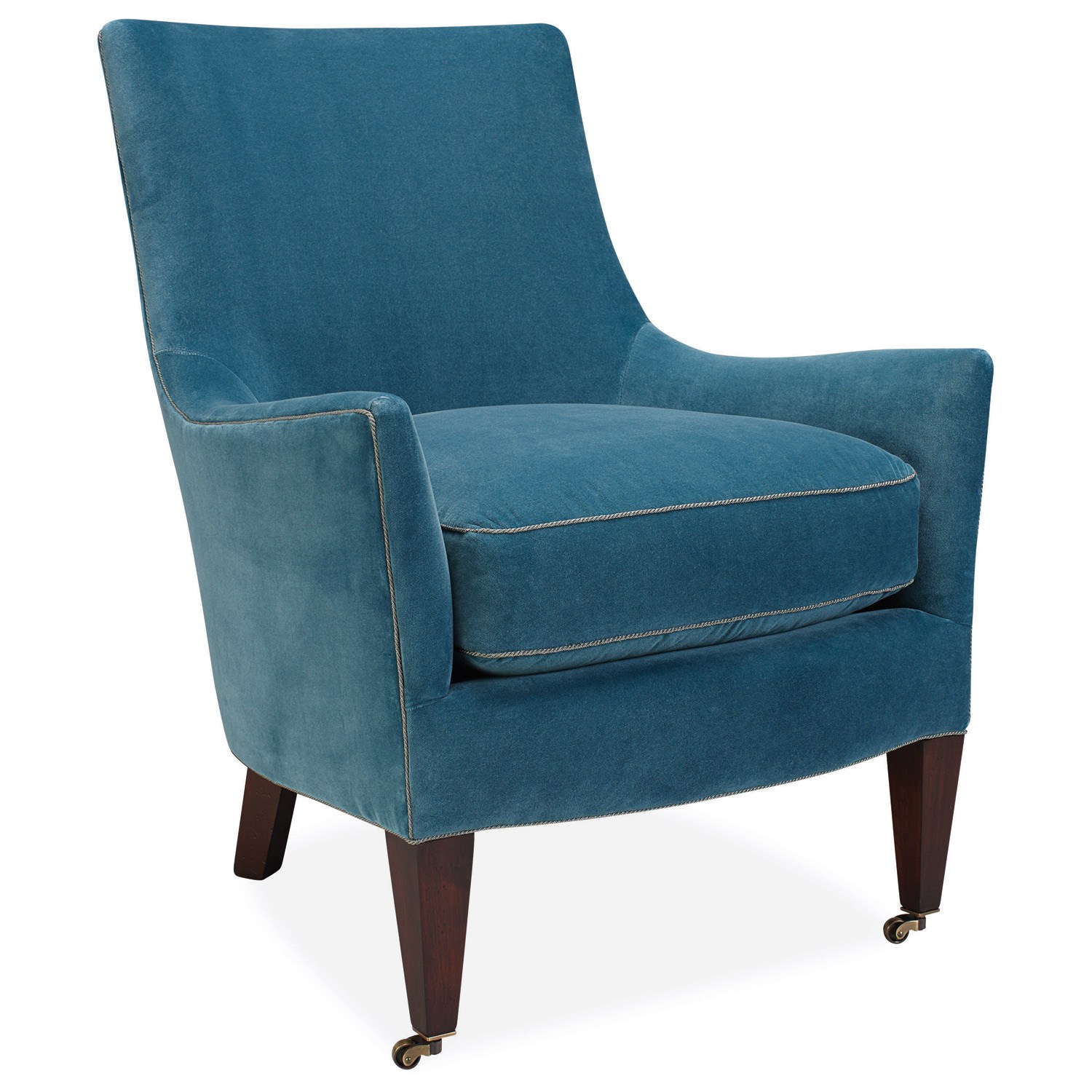The Waveland Chair‘s back and arms flare slightly, creating sleek lines that offer a contemporary contrast to the armchair’s plush seat cushion. Supported by tapered wooden legs on casters, this chair is available in a variety of fabrics and finishes for a custom look. Soy-based foam cushion wrapped in regenerated fibers and sewn into 100% cotton downproof ticking. Made in the USA using sustainable, eco-friendly production practices. Shown in Peacock. $1,158. Buy here.