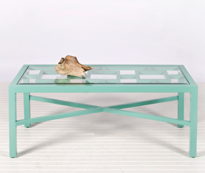 This lovely Winter Harbor Indoor/Outdoor Coffee Table in Turquoise features a powder coated turquoise finish with a beveled glass top. Can be used indoors or outdoors. Measures 18â€H X 45â€W X 20â€D. Table is also available in Green, Orange, Pink or White. Check out the coordinating Sag Harbor Side Table. $897.50. Buy here.