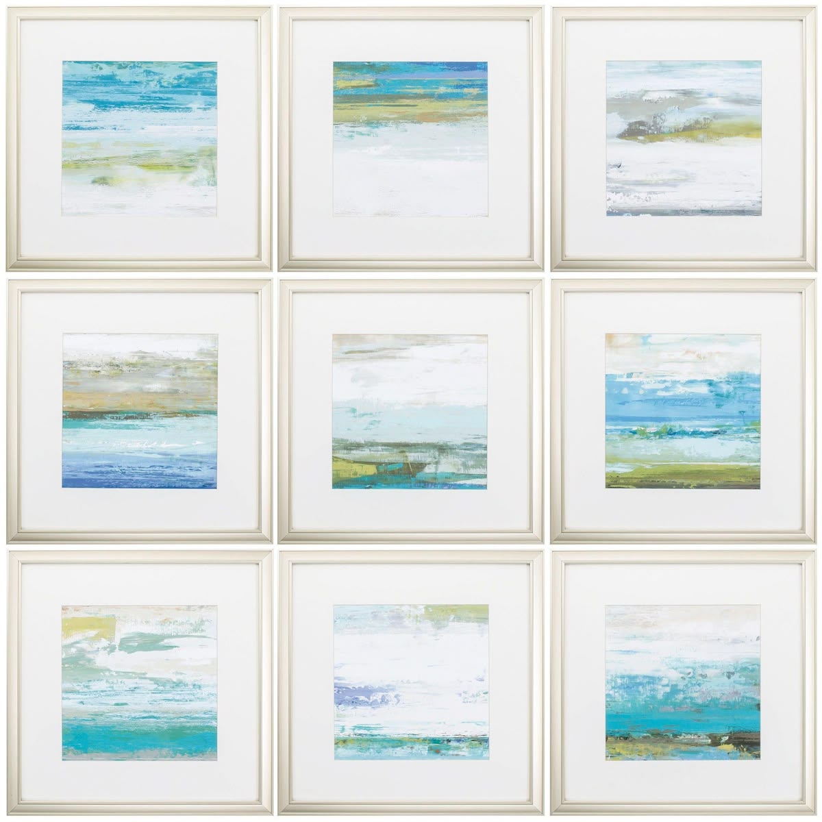 This Paragon Beach Wash Blue Wall Art is a set of nine coastal inspired abstract landscapes that make a stunning statement. Matted in white and framed in a champagne gold finish moulding. 20×20. $836. Free Shipping. Buy here.