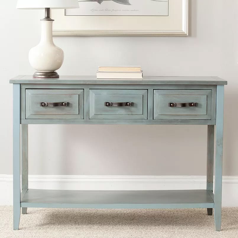 Put the finishing touch on your entryway with this Safavieh Aiden Console Table in Antique Pale Blue. The rustic finish adds a stylish touch while drawers keep your items tucked away. $289.99. Free Shipping. Buy here.