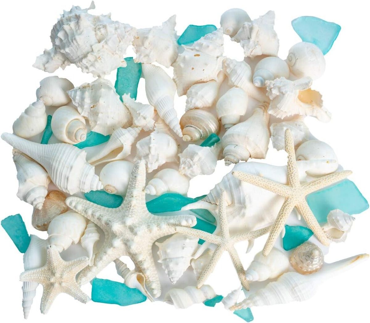 This Seashell & Sea Glass Mix includes one pound or about 30 real shells, 4 actual starfish, and several pieces of manufactured aqua blue tumbled sea glass. Perfect for bowls or vases, wreaths or garlands, weddings or crafting projects. $25.97. Free Shipping. Buy here.