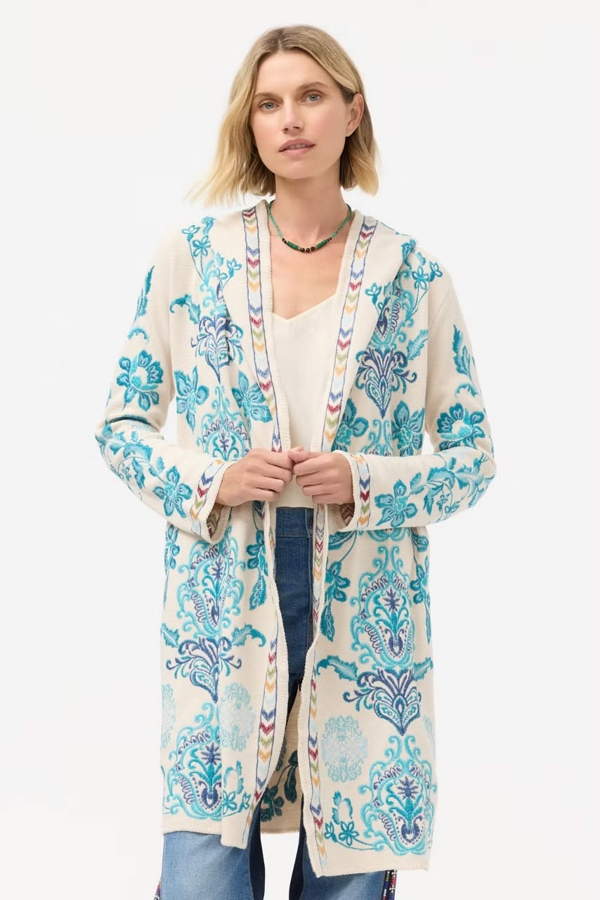 Beautifully embellished with icy blue embroidered detailing, the Johnny Was Vittoria Biya Duster is an eye-catching layering piece. Featuring an open front and attached hood, this cozy duster is finished with pockets at the sides. Sale $264. Free Shipping. Buy here. Extra 15% off with first purchase $528