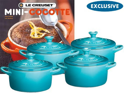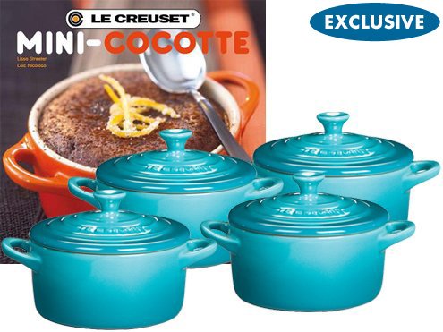 This exclusive Le Creuset Set of 4 Round Stoneware Mini Cocottes in Caribbean includes a bonus cookbook dedicated to the great features and benefits of the Mini Cocotte. Perfect for gift-giving, this set comes in a beautifully packaged hat box with lid.