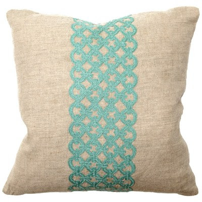 Enliven a room with modern chic as this Link Turquoise Embroidery Pillow Pair add a dose of trendsetting color and inventive design. An embroidered turquoise link motif is beautifully set against a warm natural linen background. Sold as a pair, the down-filled pillows easily blend with other solids and patterns for an eclectic look on a sofa, chair or bed. Pillows each measure 18″ x 18″. Include 95/5 feather down inserts. $138. Buy here.