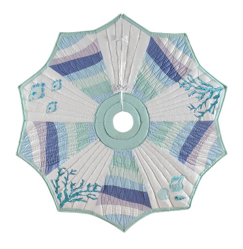 The Ocean Waves Tree Skirt features quilted fabric, scalloped edging, ribbon closure and appliqued sea designs. Measures 54 inches. Made of 100% cotton. $80. Buy here.
