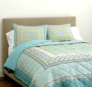 The Neelam Teal Quilt is lightweight and made of fine quality cotton voile that is screen-printed by hand and quilted in Jaipur, India. Inspired by the tradition of block printing, this type of handcrafted design dates back to Moghul times, and is an art form that continues to flourish in family-run workshops today. You’ll love the way our easy-care Neelam Teal Quilt brings a gorgeous new look to your bedroom. Neelam Teal Quilt with 2 Shams is 100% cotton voile, polyester fill. $79.99. Buy here.