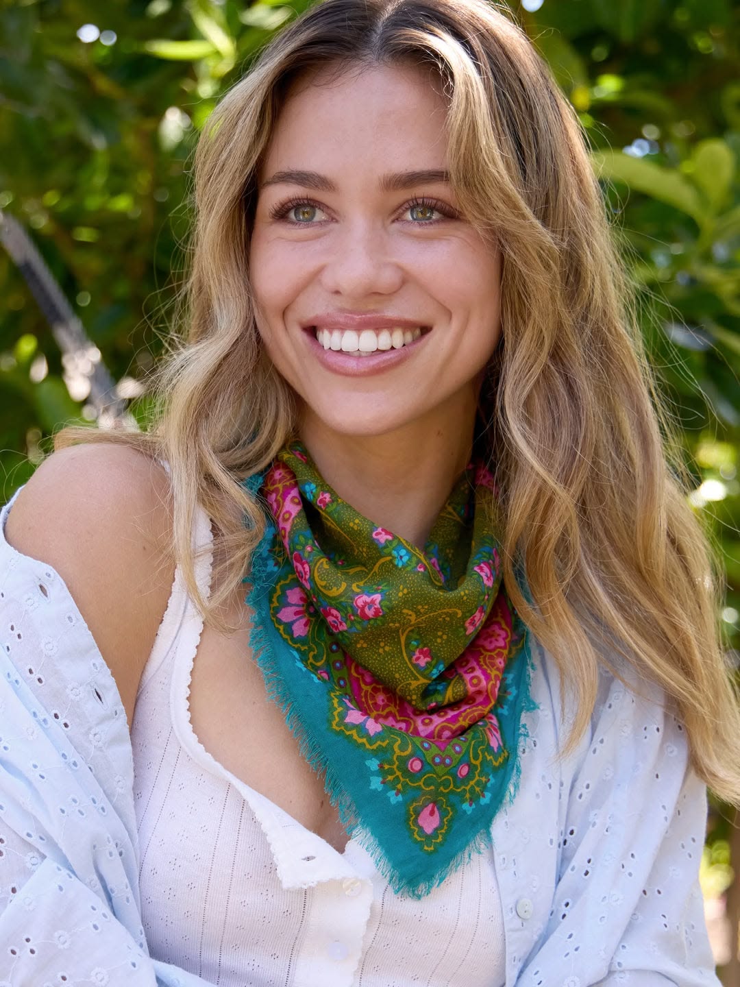 This vibrant, lightweight Printed Cotton Bandana effortlessly transforms from a classic neck scarf to a headband, hair wrap, wrist accent, bag tie, or even a chic face covering—bringing a pop of color and personality to any look. 100% cotton. $14. Buy here.