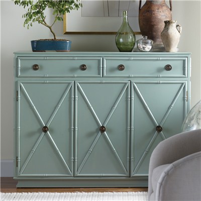 Bring style and function to your living room, bedroom or dining room with the Somerset Bay Gustavia Cabinet, as bamboo-inspired, criss-cross molding gives it a polished yet creative look. Two drawers top three petitioned cabinets with hinged doors, each concealing one adjustable shelf. Made from renewable plantation-grown mahogany, this piece is finished with fine antiquing and distressing techniques to achieve a look of gently aged patina in a palette of soft hues. Shown in Cotton Candy. Drawers constructed with dovetail joints, wooden pegging & wooden drawer slides. $3,567. Free premium shipping. Buy here.