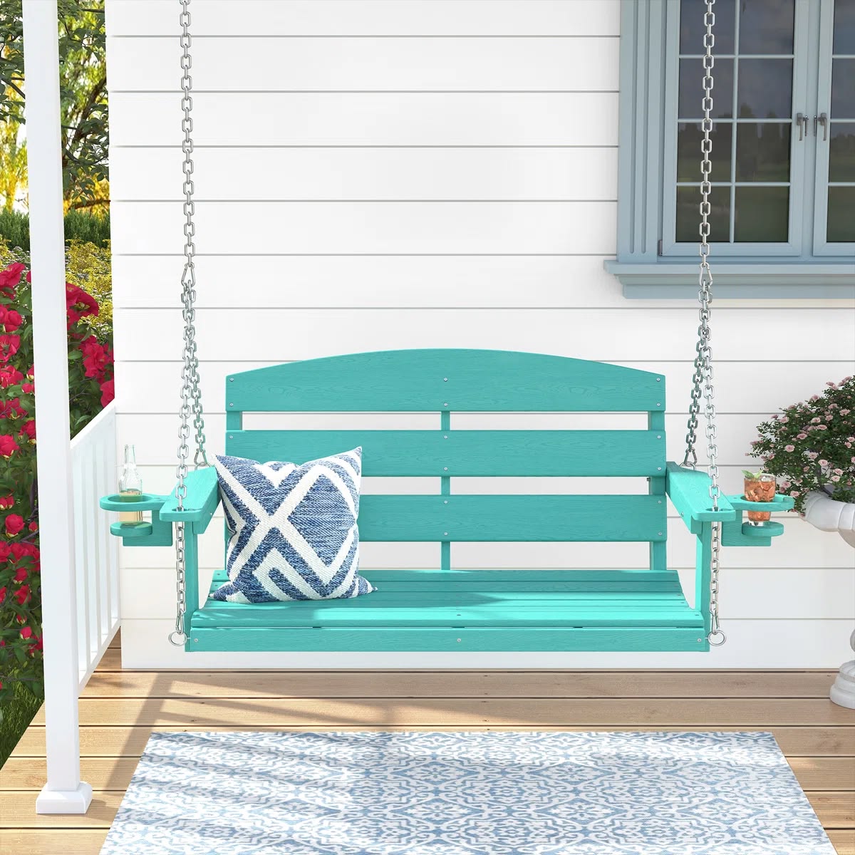 With its sturdy and stable design, this Outdoor Porch Swing in Teal offers cozy seating for you and a loved one to unwind. The unique cup holder design conveniently holds your drinks while you swing away. $379.99 Sale $333.99. Free Shipping. Buy here.