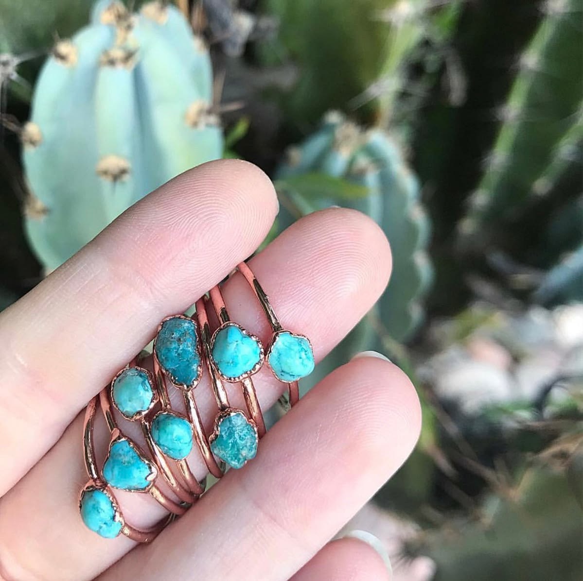 This Turquoise Raw Stone Ring features a tiny raw Morenci, AZ turquoise nugget electroformed with pure copper, creating a simple and rustic, every day style ring. Great for stacking! No two are alike, but all are equally beautiful. $39.99. Free Shipping. Buy here.
