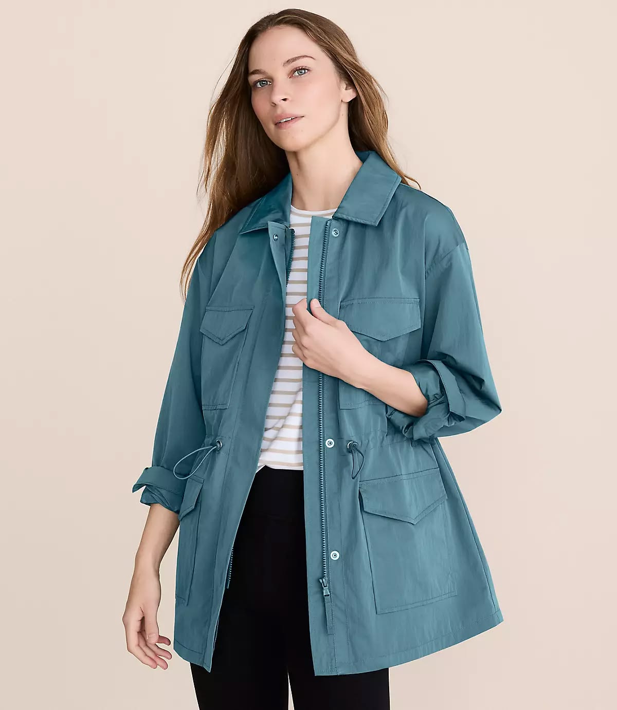 This Water Resistant Utility Jacket defines utility cool from the water resistant fabric to all the handy pockets and the super flattering drawstring waist with bungee stoppers. $160 Sale $80. Free Shipping. Buy here.